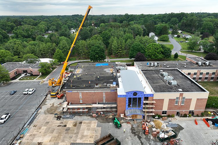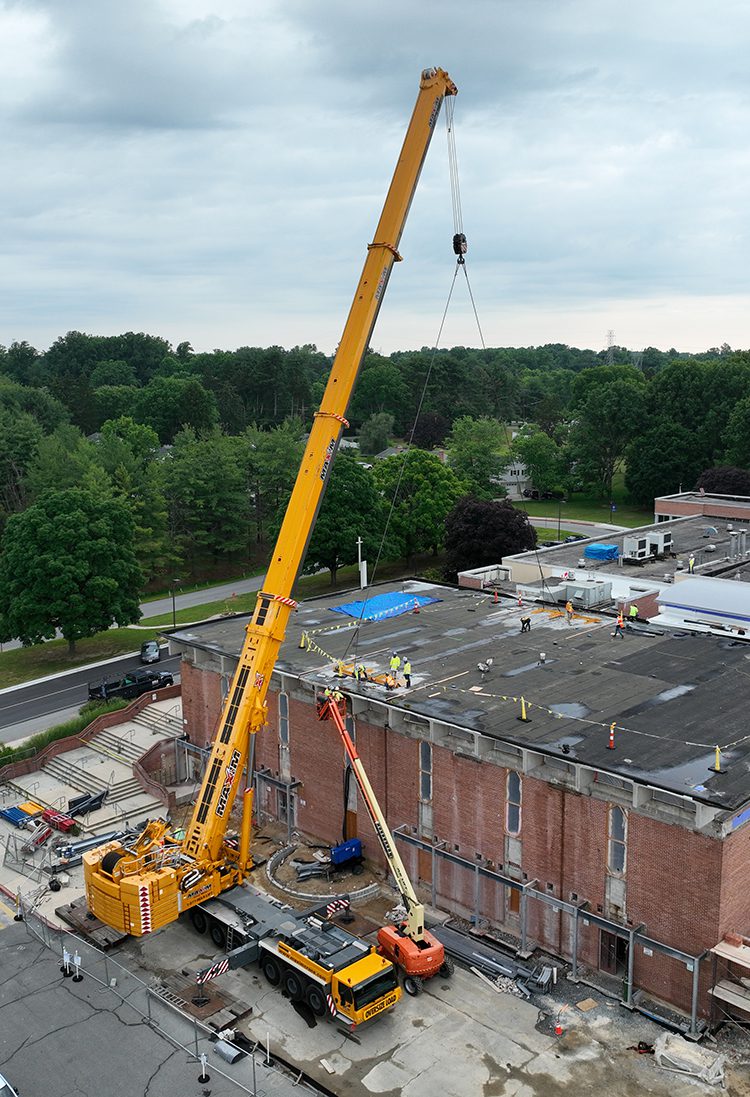 Once the students had their last day, it was time to remove the roof tees and create other interior and exterior openings. This required a variety of shoring and bracing to protect the remaining structure and ensure the safety of the construction crews.